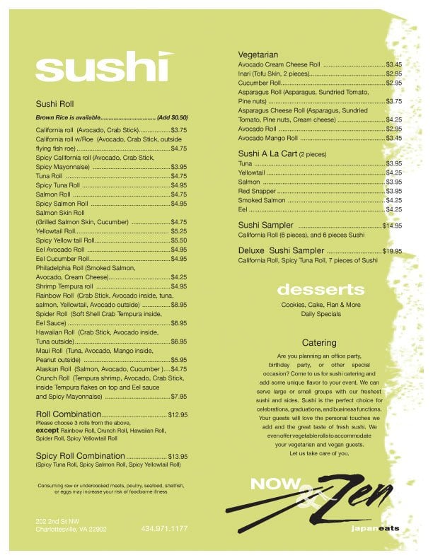 Introducing Now & Zen, a delightful Japanese restaurant nestled in the heart of Charlottesville at 202 2nd St NW. Known for its vibrant menu, Now & Zen offers an array of house-made dumplings, including both traditional and spicy options, that are crafted to perfection. Starting at just $8, these dumplings set the stage for an unforgettable dining experience.